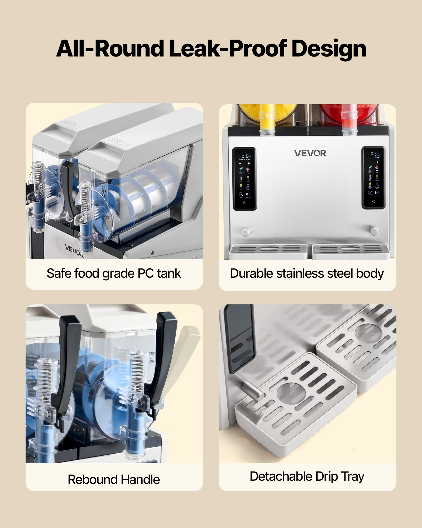 Vastupidav ja kergesti puhastatav: roostevabast terasest korpuse ja toidukvaliteediga paagiga on see kommertslik slushy-masin loodud kestma ja on kergesti puhastatav. Paagil on ühe nupuga automaatne puhastus ning moodulkomponente saab vaevata hoolduseks ja puhastamiseks hõlpsalt lahti võtta.