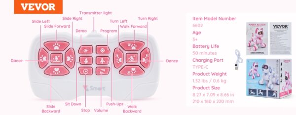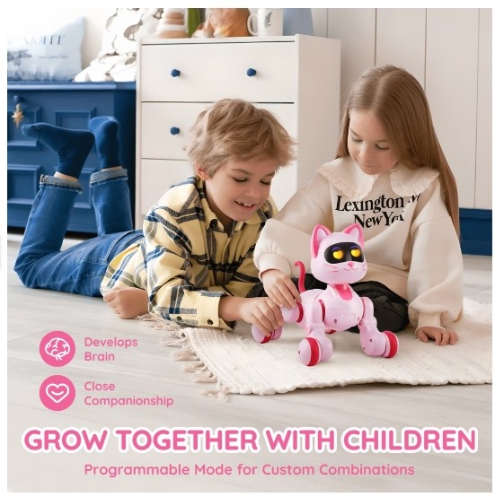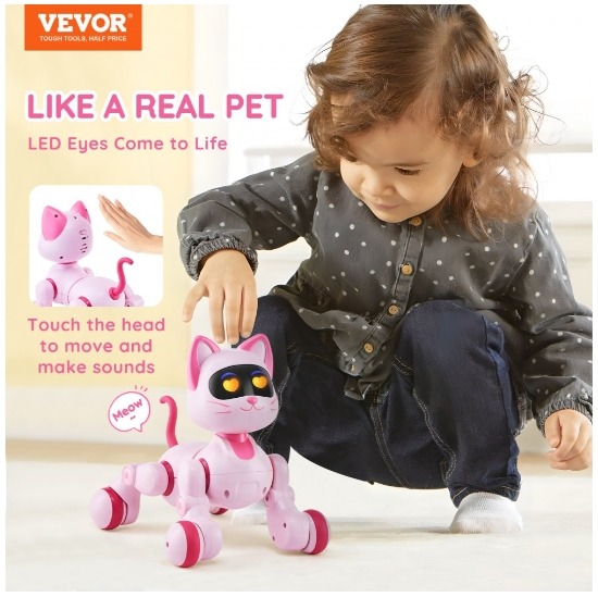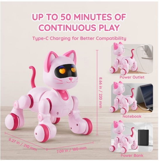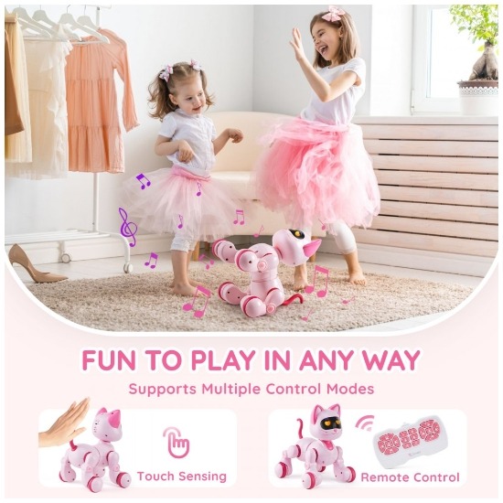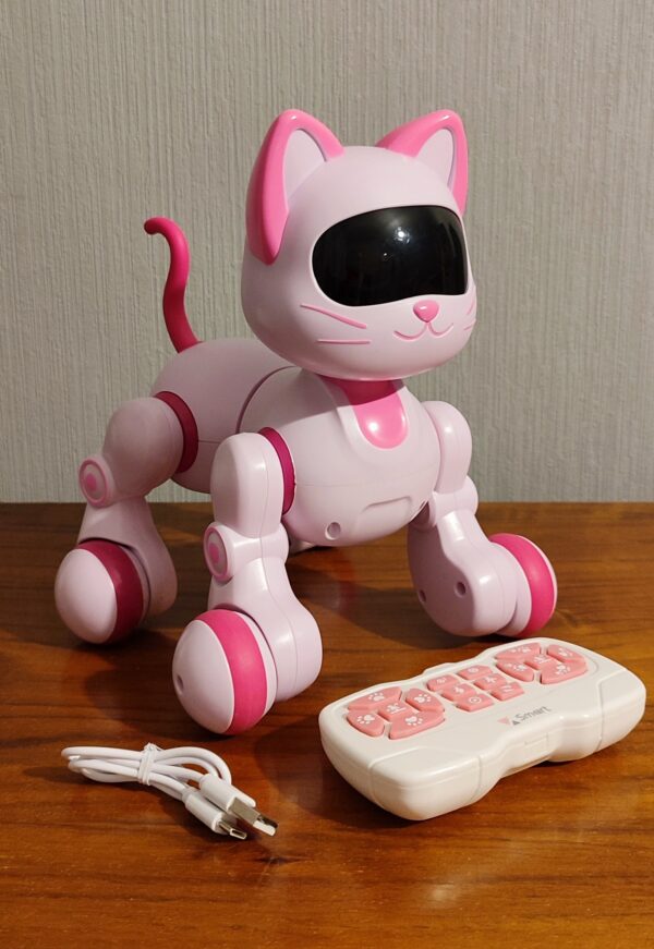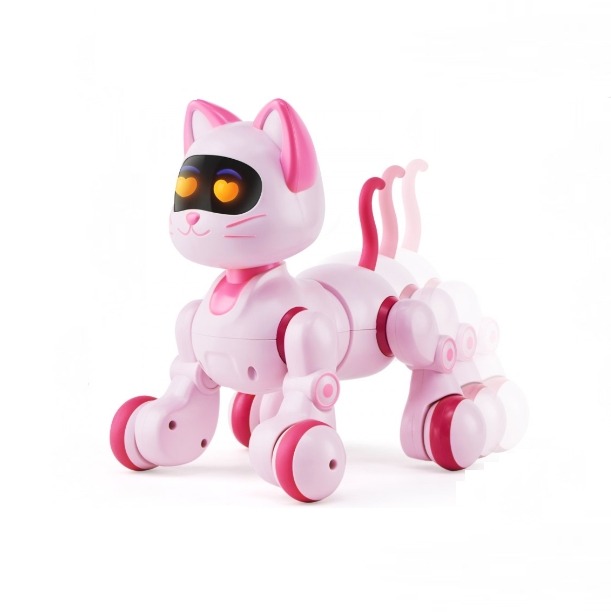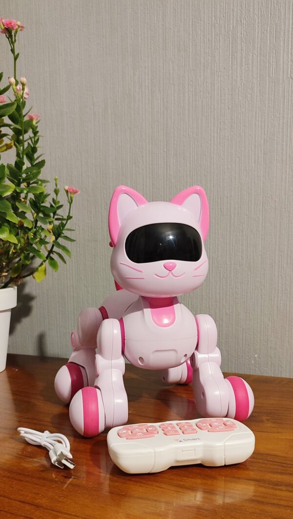 See puldiga juhitav vahva roosa robotkass oskab teha liigutusi ja laulda, on armsat lemmiklooma meenutava disainiga ja pilkupüüdvate LED-tuledega – kõik see on mõeldud laste meele lahutamiseks.