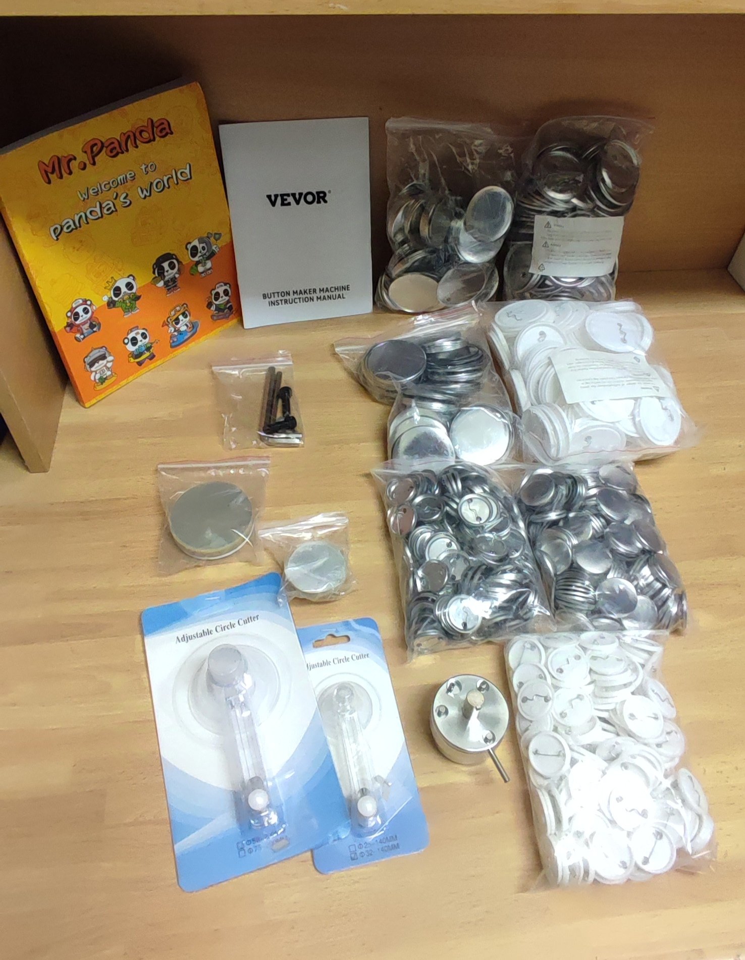 Komplekti kuuluvad: rinnamärgimasin, 1 x 32 mm rinnamärgivorm, 1 x 58 mm rinnamärgivorm, 2 ringikujulist paberilõikurit, 200 tk x 32 mm ja 300 tk x 58 mm rinnamärgi toorikud, 2 x kuuskantvõtit, 2 seibi , 1x ingliskeelne kasutusjuhend. Lisaks saate kaasa unikaalse “Mr. Panda võluraamat” rohkete armsate panda piltidega, millest teha rinnamärke.