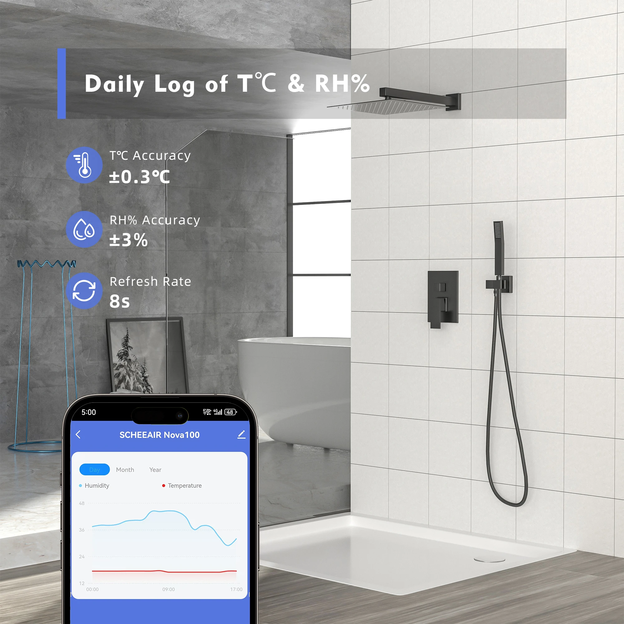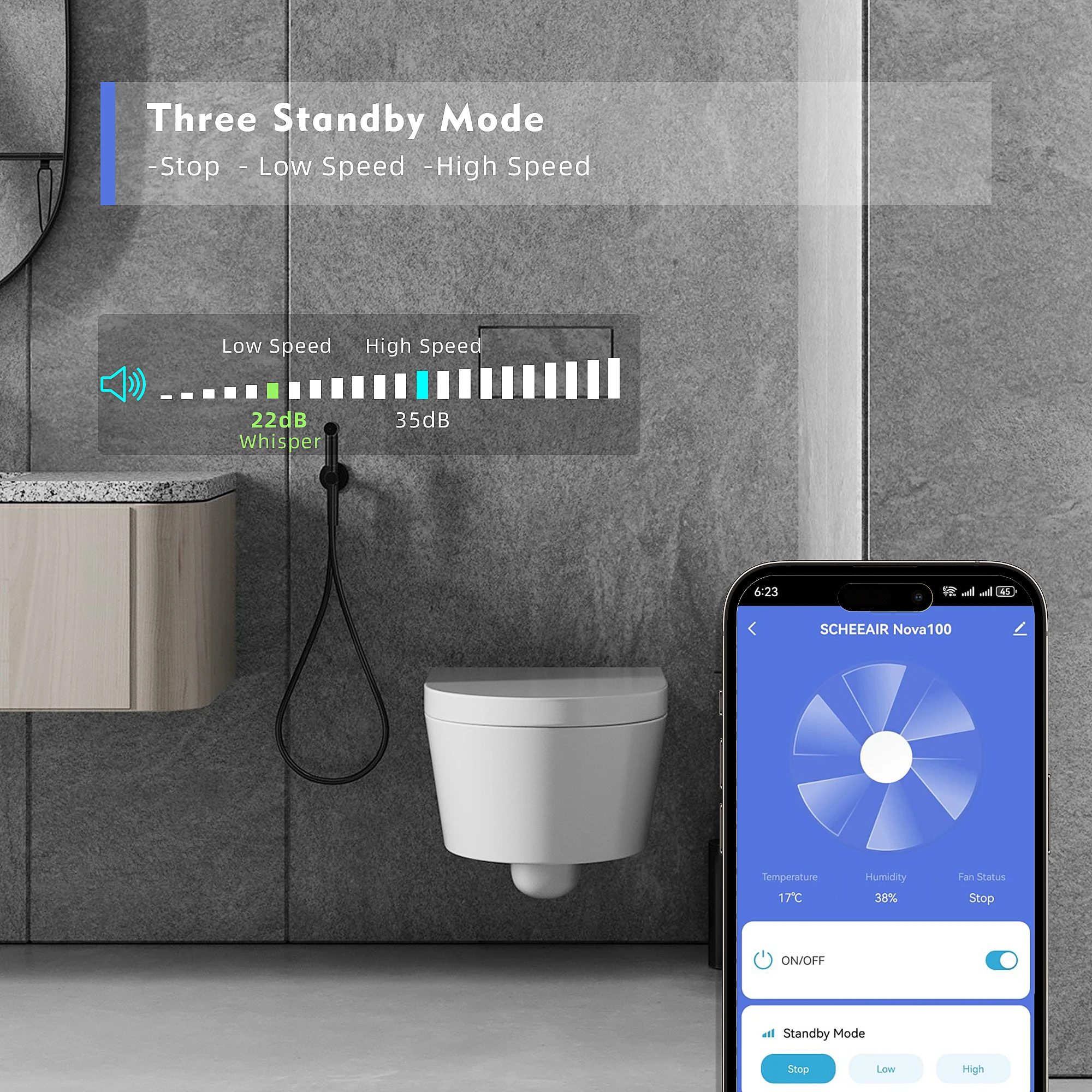 Niiskusandur 40–100% ulatusega: Hoidke oma vannitoa niiskustaset kursis 40–100% ulatusega anduriga, tagades optimaalse mugavuse ja õhukvaliteedi.