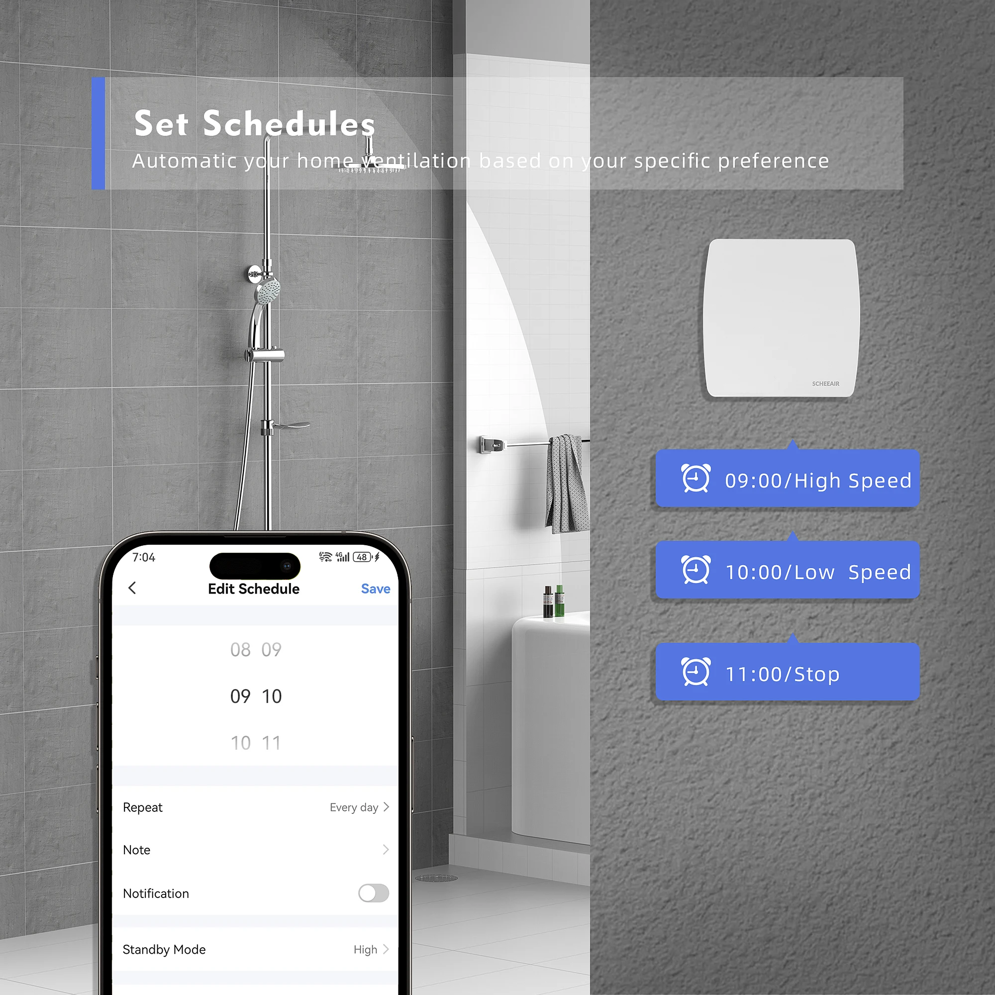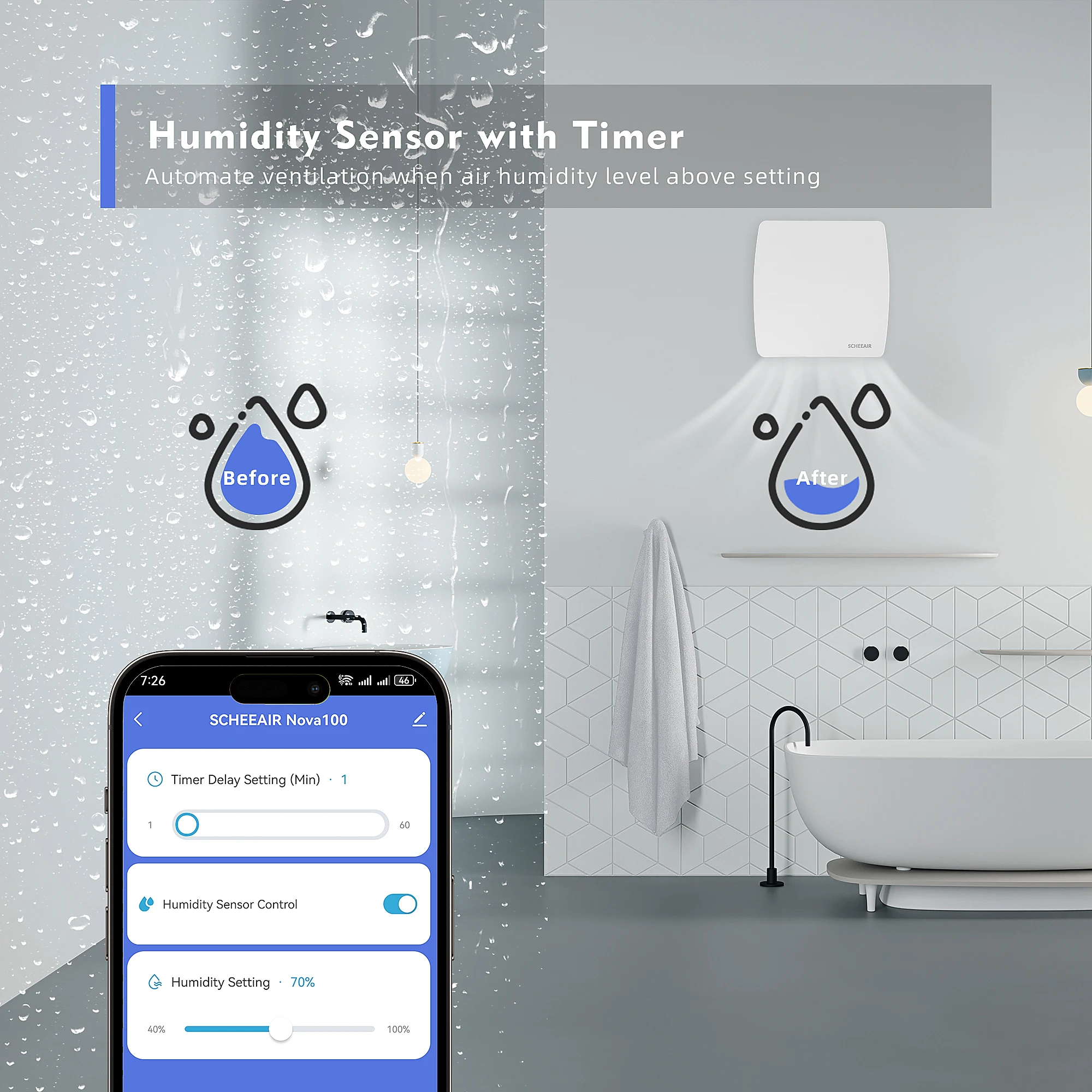Liikumis- ja niiskusandur taimeriga: Automatiseerige oma vannitoa õhuvoolu liikumisanduri ja niiskusanduri ning mugavuse tagamiseks kohandatava taimeri abil.