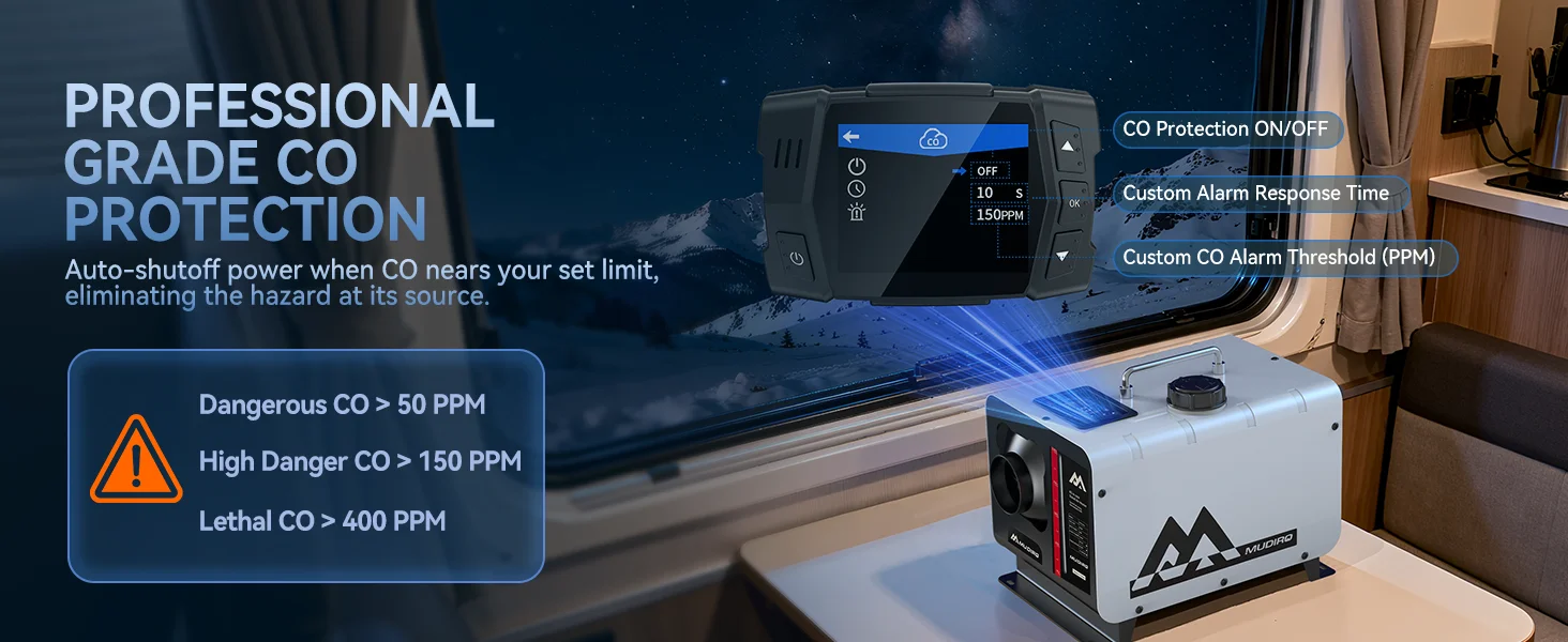 Sisseehitatud vingugaasiandur käivitab alarmi ja lülitab seadme automaatselt välja, kui tuvastatakse ohtlik tase.