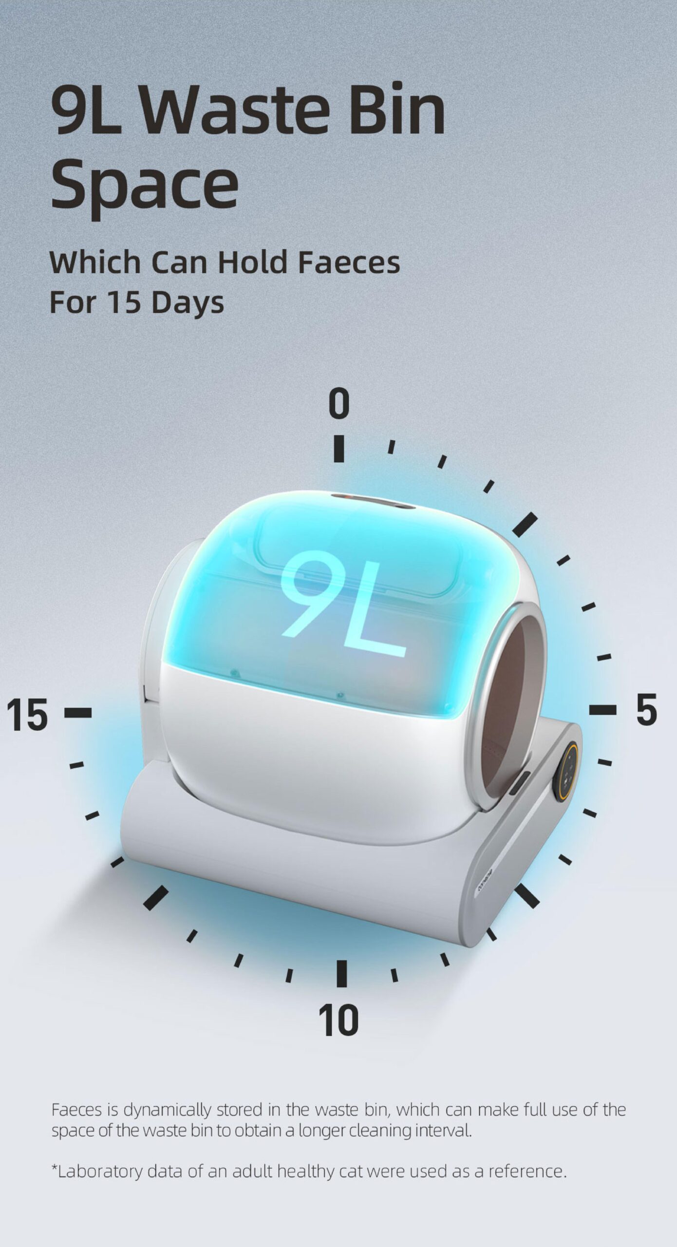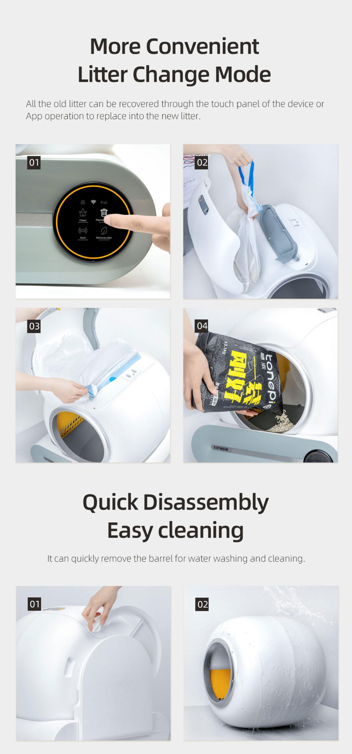 KASUTAMINE: Ühendage kassiliivakast vooluvõrku ja lisage sobiv kassiliiv. Automaatne süsteem puhastab liivakasti pärast igat kasutuskorda. Jäätmekonteiner tuleks tühjendada vastavalt vajadusele.