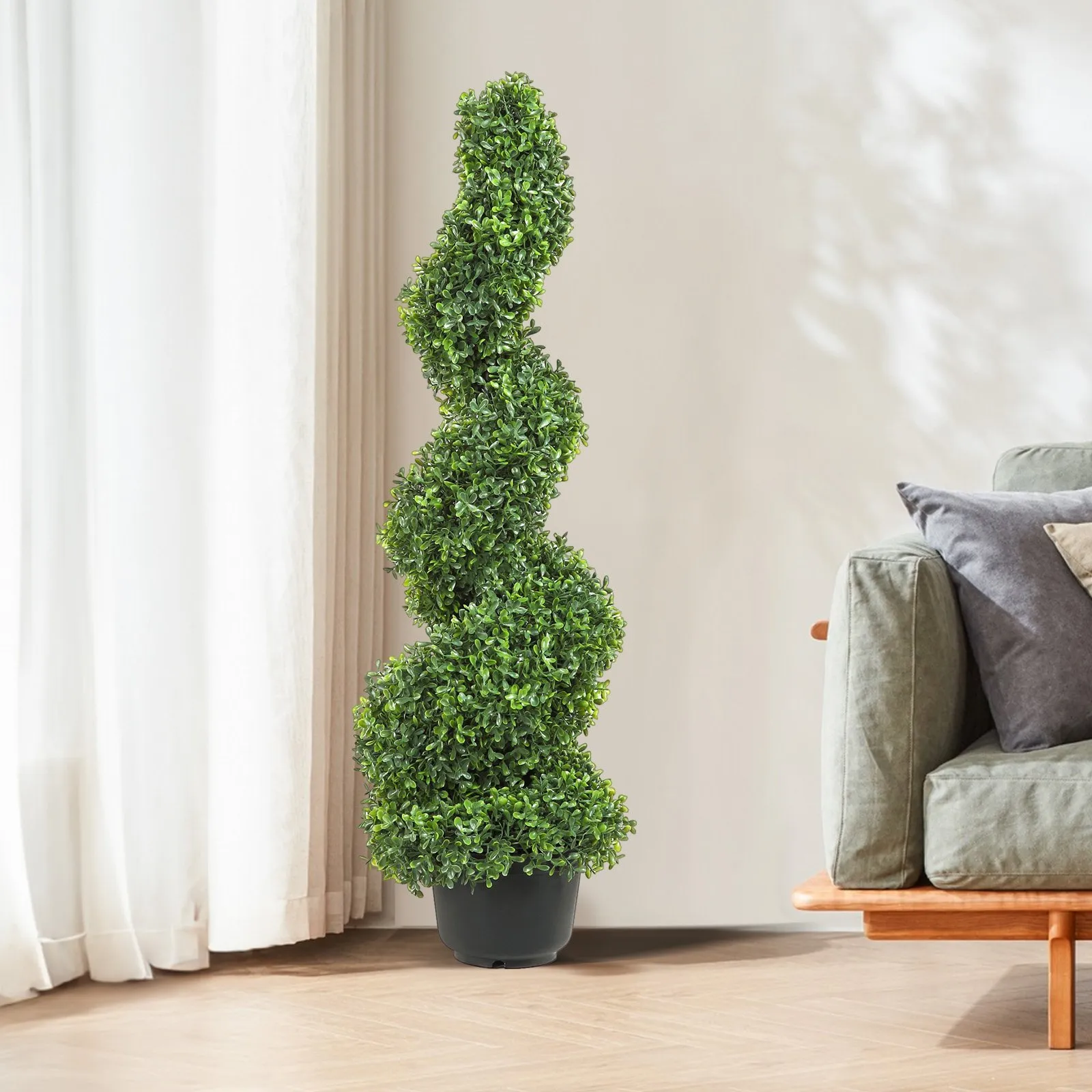 Vastupidav ja ilmastikukindel: valmistatud kvaliteetsest PE-materjalist, taluvad need puud päikest, vihma ja tuult ilma pleekimise või deformeerumiseta. Ideaalne nii sise- kui ka välistingimustes kasutamiseks, pakkudes kauakestvat rohelust ilma hoolduseta.
