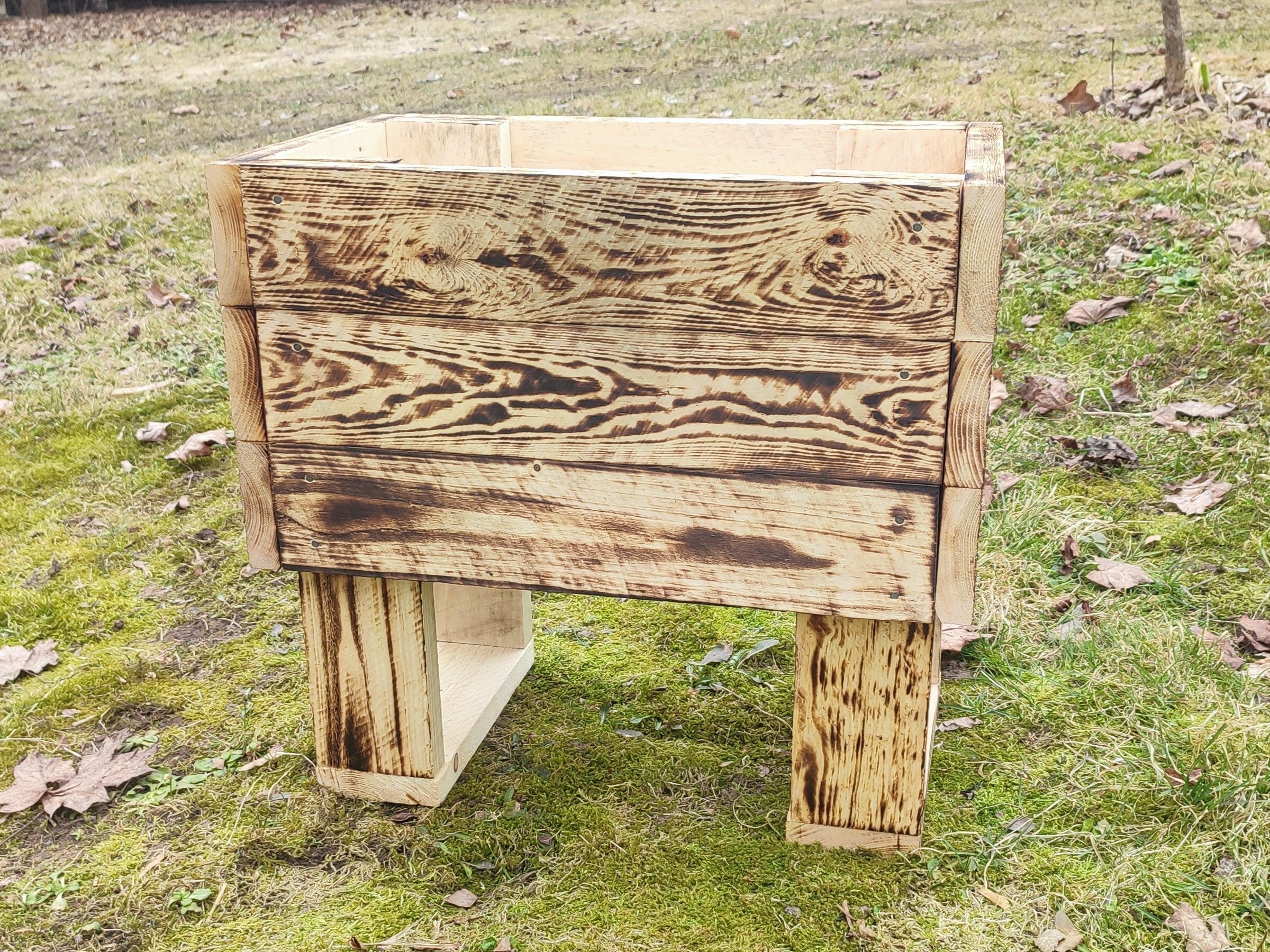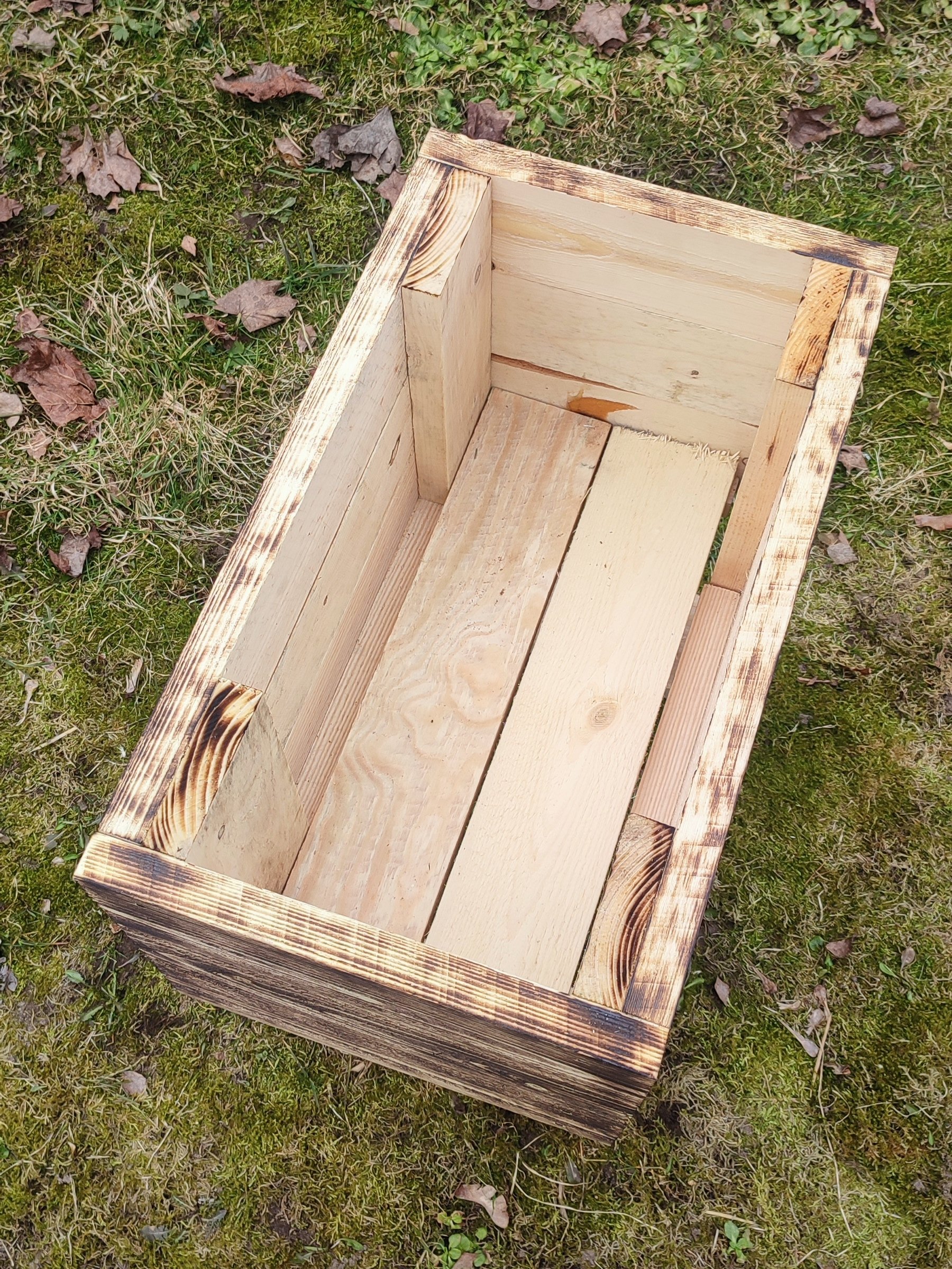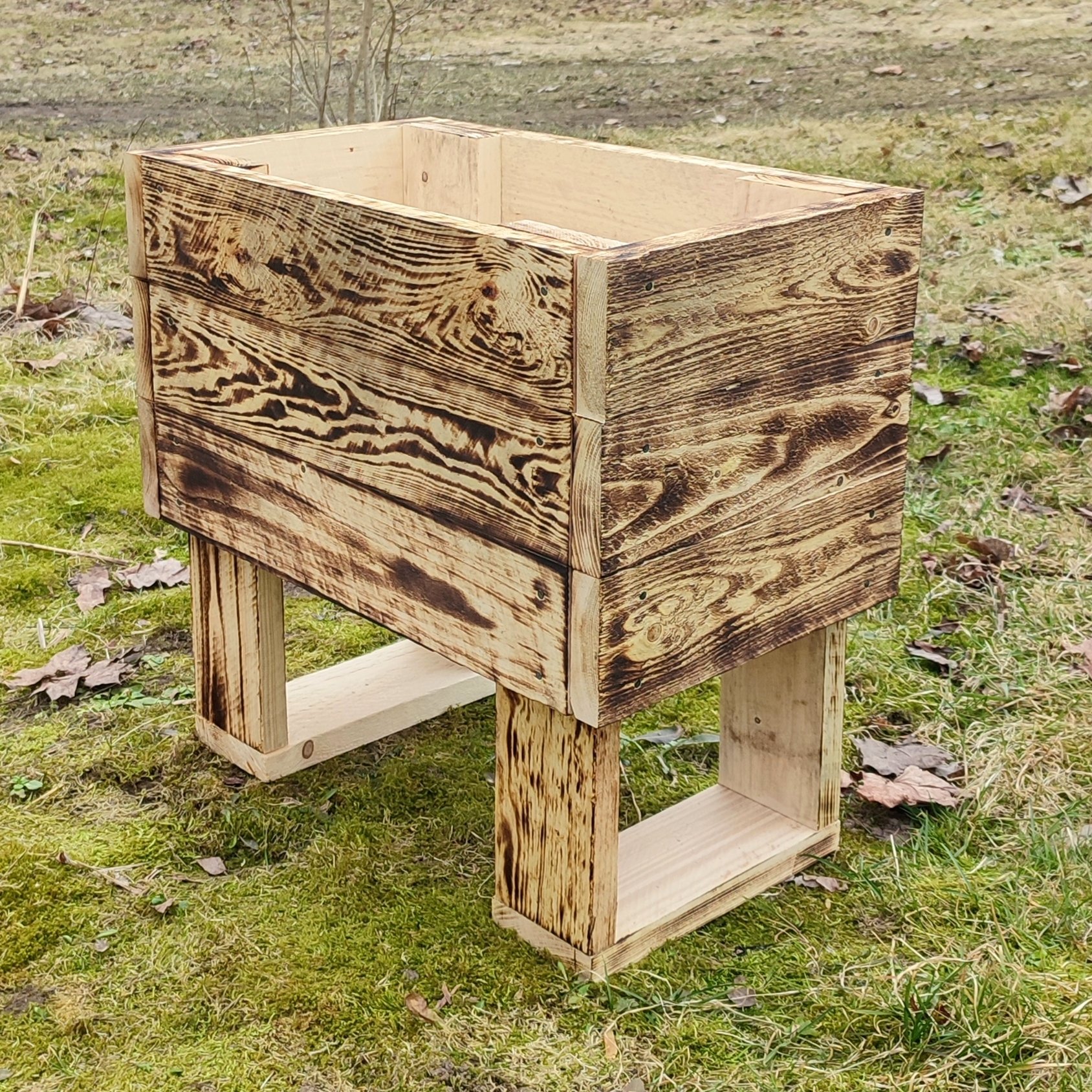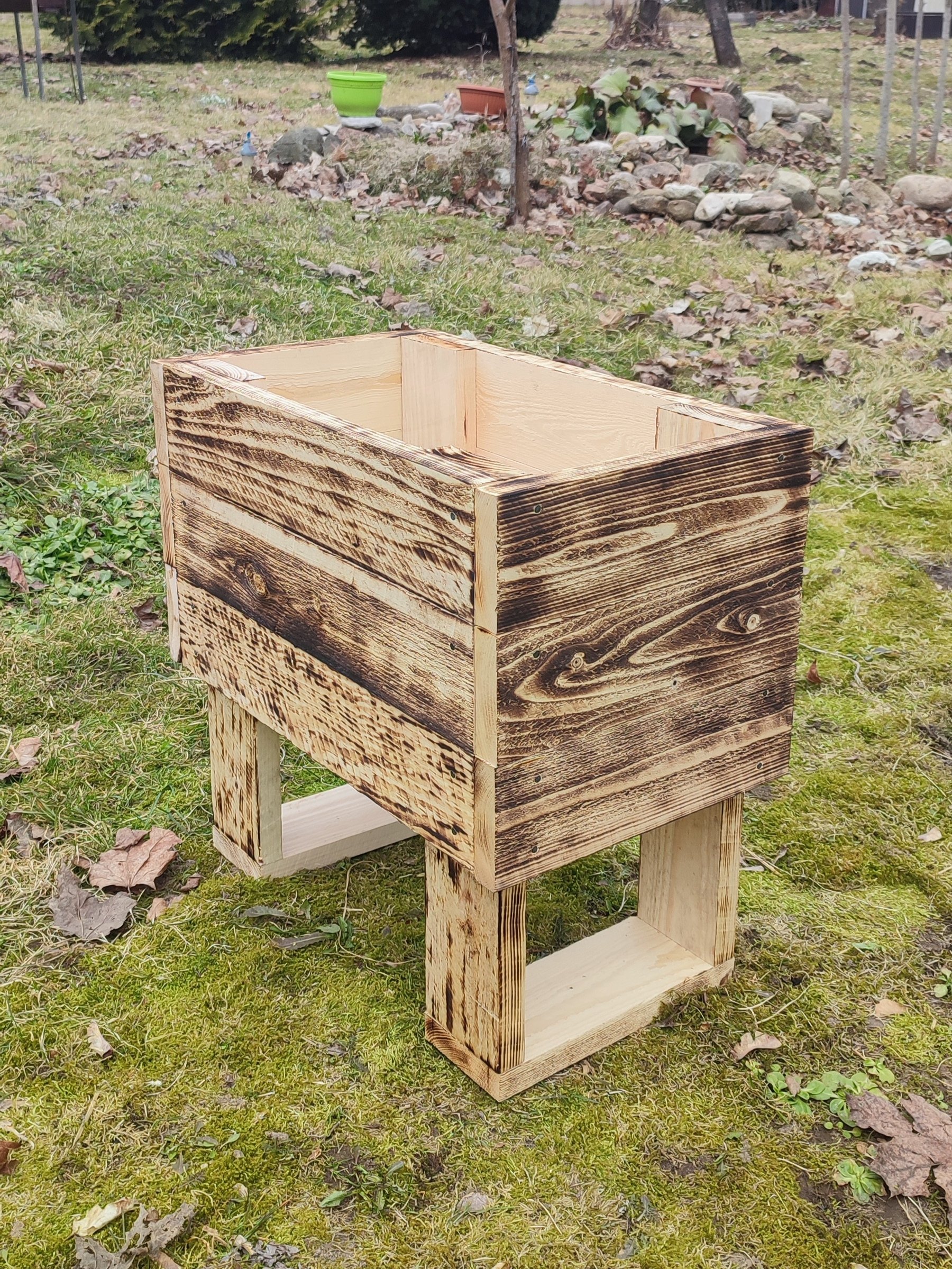 Käsitööna valminud põletatud puidust lillekast