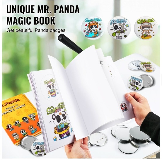 Komplekti kuuluvad: rinnamärgimasin, 1 x 75mm rinnamärgivorm, 50tk x 75mm plastikust ja 50tk x 75mm metallist rinnamärgi tagused, 100tk x 75mm läbipaistvad kiled, 100tk x 75mm metallist kettad, 50tk x 75mm tühjad paberitoorikud, 1tk paberilõikur, 2 x kuuskantvõtit, 2 seibi , 1x ingliskeelne kasutusjuhend. Lisaks saate kaasa unikaalse “Mr. Panda võluraamat” rohkete armsate panda piltidega, millest teha rinnamärke.